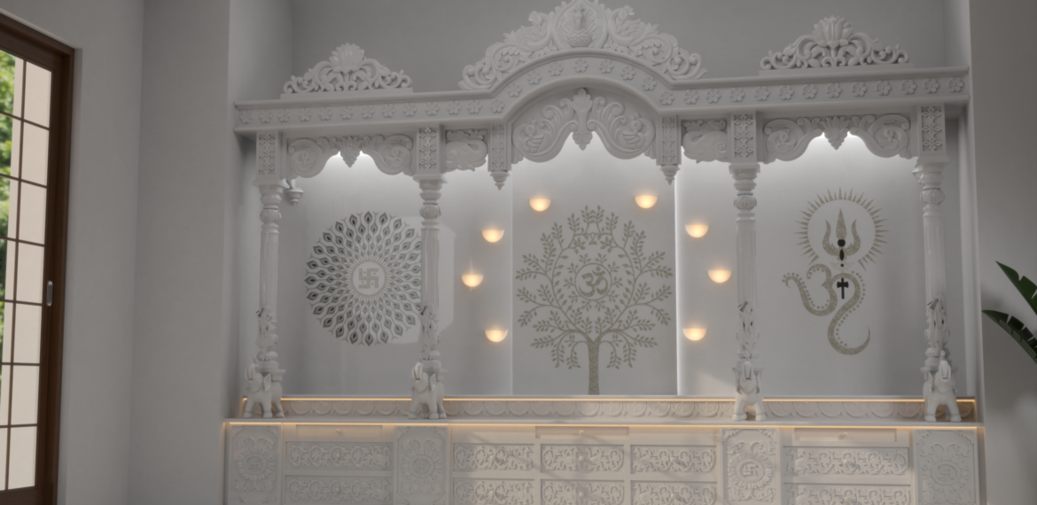 Your temple should comfortably accommodate idols, lamps, and पूजा essentials without feeling cluttered. Consider: